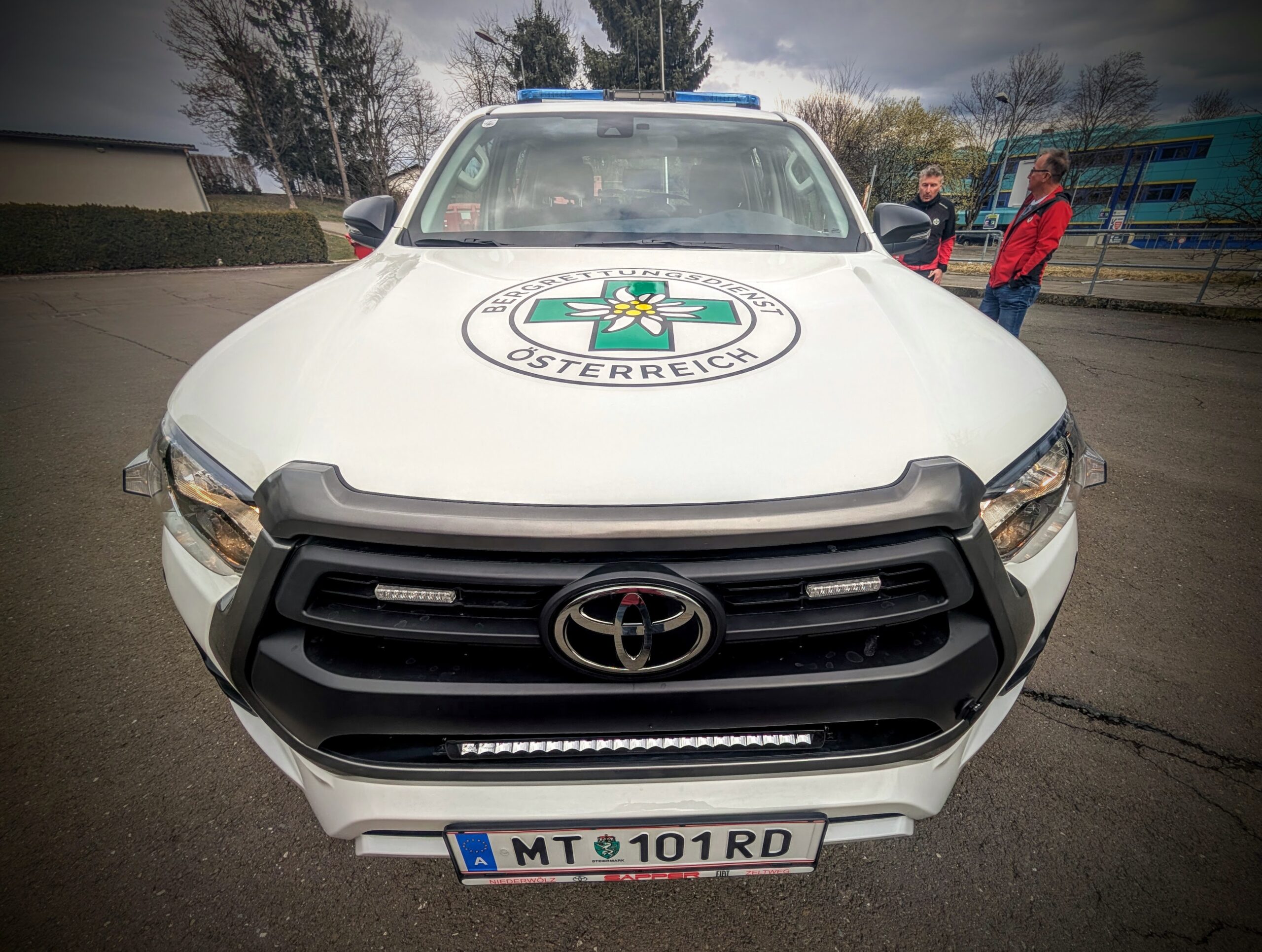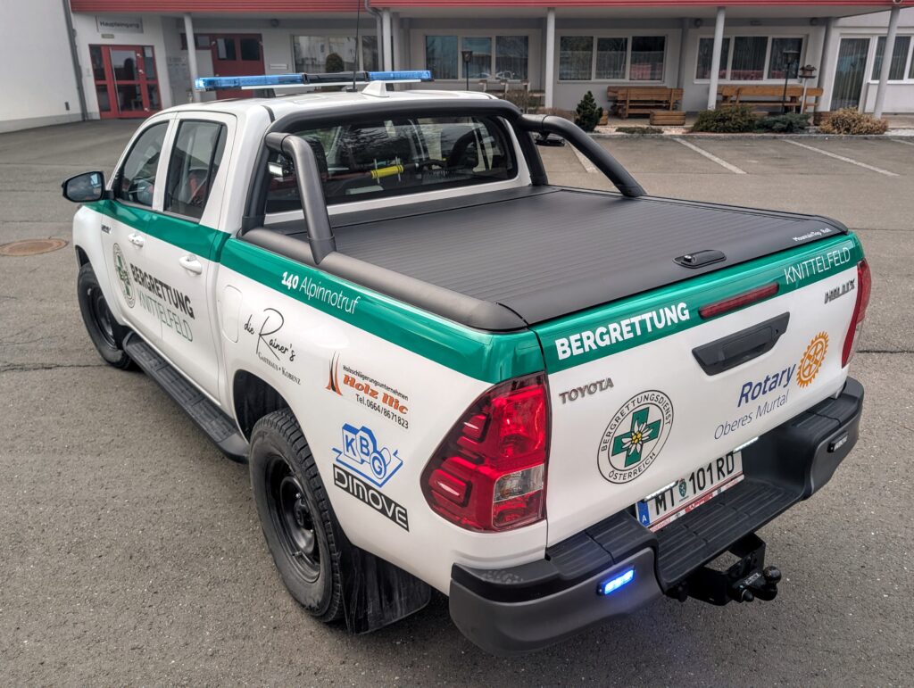 Der Toyota Hilux zeichnet sich durch seine besondere Geländetauglichkeit, Zuverlässigkeit und Vielseitigkeit aus. Er bietet Platz für fünf Bergretterinnen samt Einsatzmaterial und ermöglicht gleichzeitig durch seine Ladefläche und Adaptierbarkeit den behelfsmäßigen Abtransport von verletzten Personen. Im Winter kann er auch für den Transport des Quads verwendet werden.